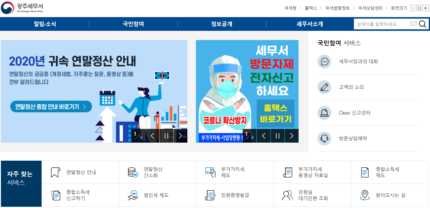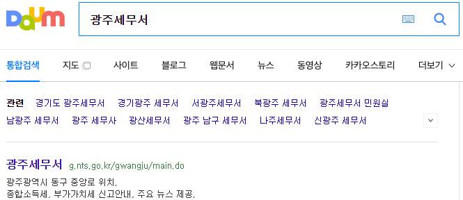광주세무서를 살펴보기 위해서는 자주 이용하시는 검색사이트에서 “광주세무서”를 검색해 주시면 간편하게 홈페이지로 접속을 하실 수가 있습니다.