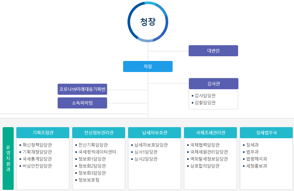 국세청이란 조직이 어떻게 구성되어 있는지도 알아보겠습니다. 홈페이지내의 조직과 기능 메뉴를 찾아가시면 아래와 같은 조직도를 보실수가 있습니다. 모든 조직도를 확인하시려면 아래를 참고해 주세요.