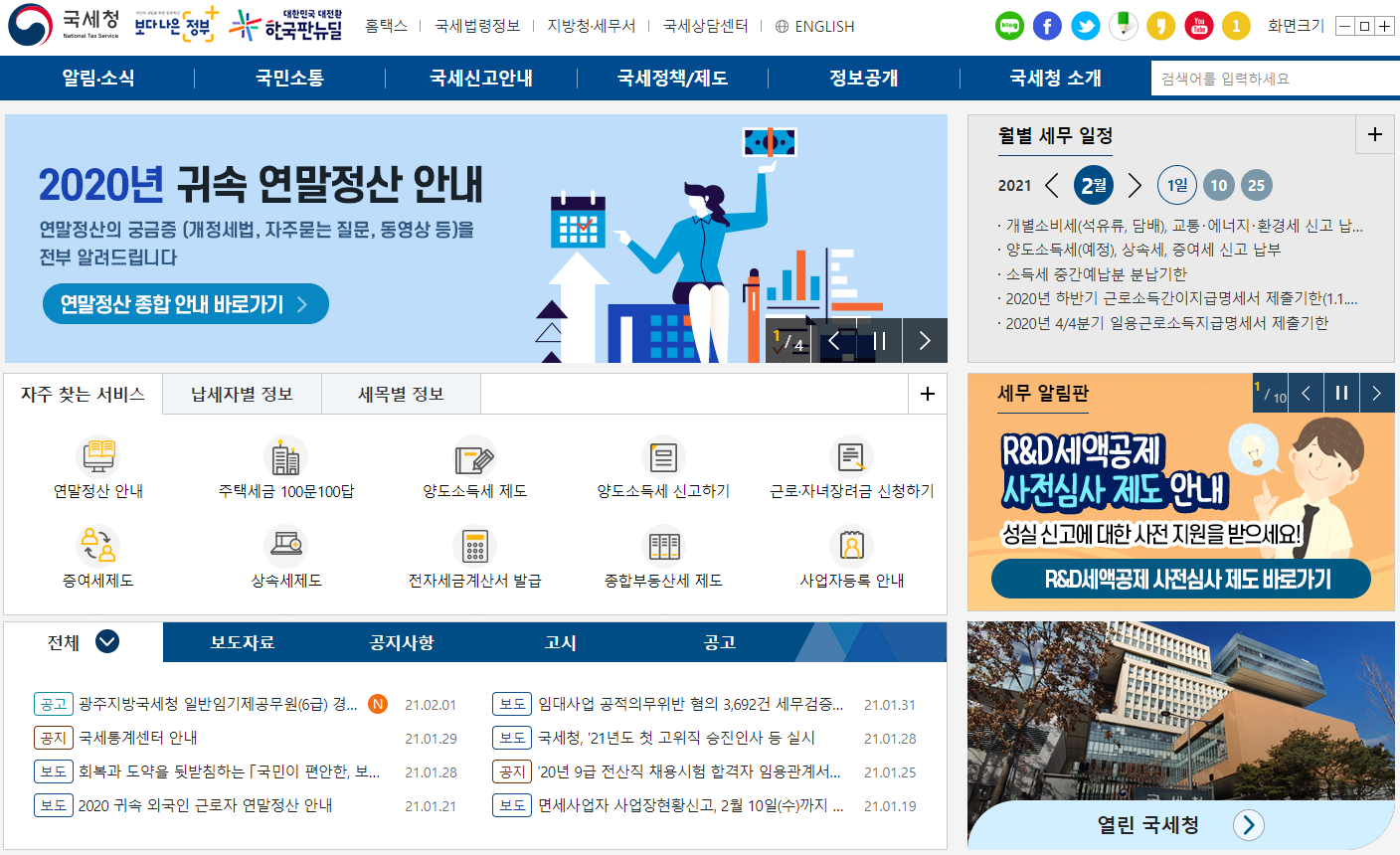 국세청 홈페이지의 메인화면입니다. 상단에는 알림소식, 국민소통, 국세신고안내, 국세정책제도, 정보공개, 국세청소개의 다양한 메뉴가 있습니다.