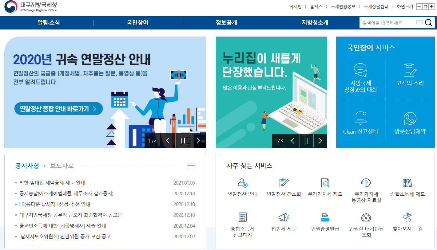 대구지방국세청을 살펴보기 위해서는 포털사이트에서 대구지방국세청을 검색해 주시면 간편하게 홈페이지로 접속을 하실 수가 있습니다.