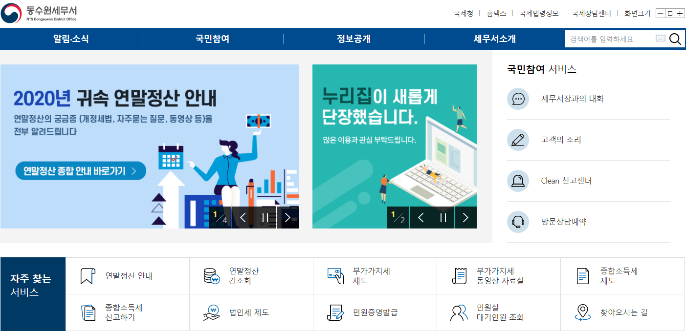 동수원세무서를 살펴보기 위해서는 검색엔진에서 동수원세무서를 검색해 주시면 간편하게 홈페이지로 접속을 하실 수가 있습니다.