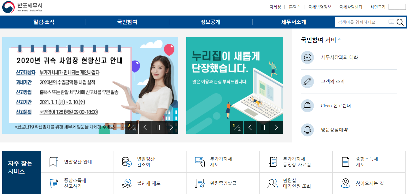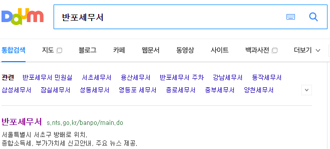 반포세무서를 살펴보기 위해서는 포털사이트에서 반포세무서를 검색해 주시면 간편하게 홈페이지로 접속을 하실 수가 있습니다.
