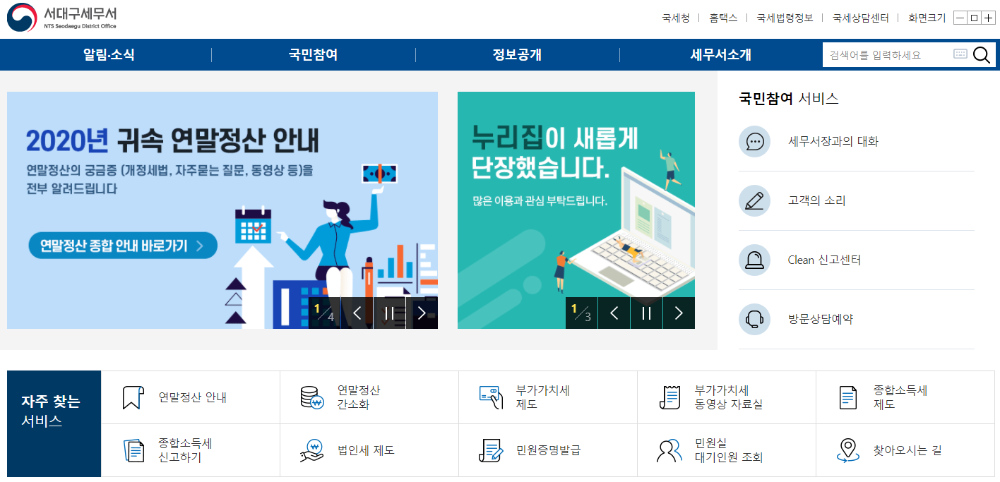 서대구세무서를 살펴보기 위해서는 검색엔진에서 서대구세무서를 검색해 주시면 간편하게 홈페이지로 접속을 하실 수가 있습니다.