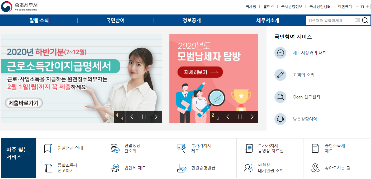 속초세무서를 살펴보기 위해서는 검색엔진에서 속초세무서를 검색해 주시면 간편하게 홈페이지로 접속을 하실 수가 있습니다.