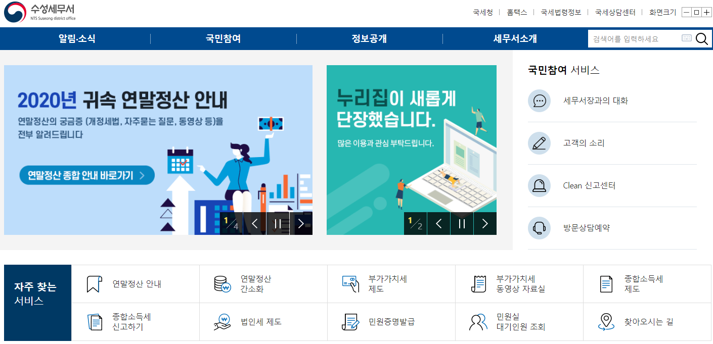 수성세무서를 살펴보기 위해서는 검색엔진에서 수성세무서를 검색해 주시면 간편하게 홈페이지로 접속을 하실 수가 있습니다. 수성세무서는 최근인 2018년에 개청을 했다고 합니다.