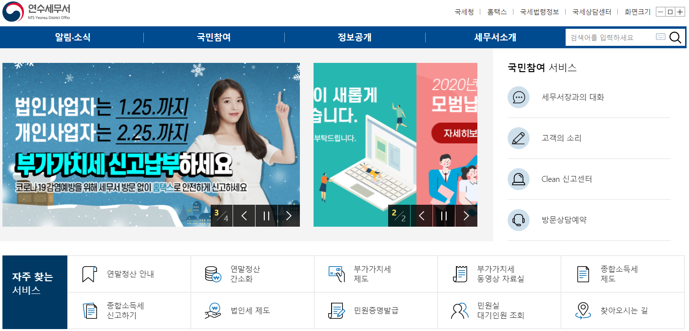 연수세무서 홈페이지의 메인화면입니다. 홈페이지 상단에는 알림/소식, 국민참여, 정보공개, 세무서소개의 주요메뉴가 위치하고 있습니다.