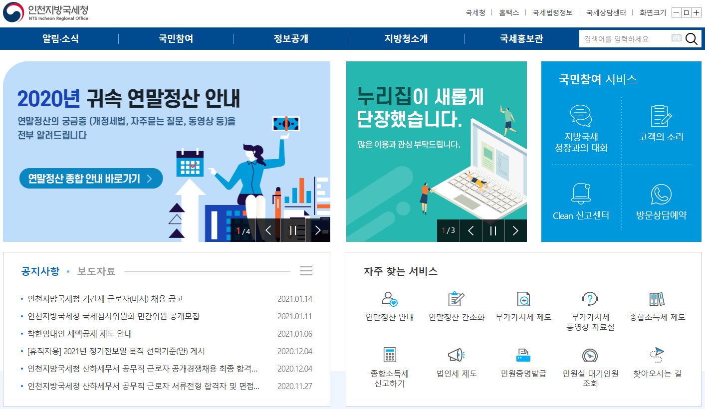 인천지방국세청을 살펴보기 위해서는 포털사이트에서 인천지방국세청을 검색해 주시면 간편하게 홈페이지로 접속을 하실 수가 있습니다.