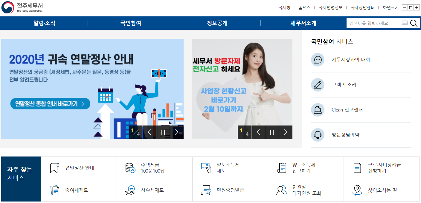 여기까지 전주세무서 홈페이지에 대해 간단하게 살펴보았습니다. 복잡한 세무 업무를 보기 위해서는 세무서를 방문하기 전에 미리 해당 세무서의 정보를 파악하고 방문하시면 더욱 더 간편하게 업무를 보실 수가 있습니다.