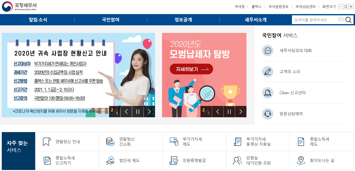 포항세무서를 살펴보기 위해서는 자주 이용하시는 포털사이트에서 “포항세무서”를 검색해 주시면 간편하게 홈페이지로 접속을 하실 수가 있습니다.